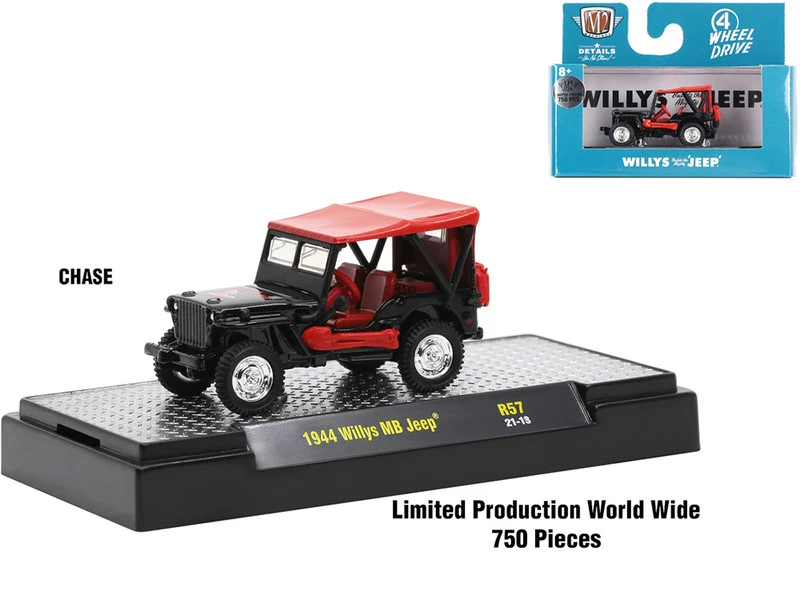 - “WILD GOOSE” CHASE CAR: 1944 Willys MB Jeep. The Body is Gloss Black, The Dash and Floor is Red, The Seats are Red, The Rims are Nickel Chrome, The Chassis is Black, The Canvas Top is Bright. Limited Edition to 750 pieces Worldwide.