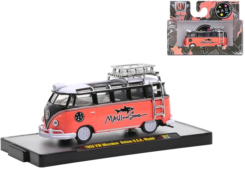 - 6) 1959 Volkswagen Microbus Deluxe U.S.A. Model with Roof Rack and Ladder “Maui and Sons” Coral Red and Black with White Top.