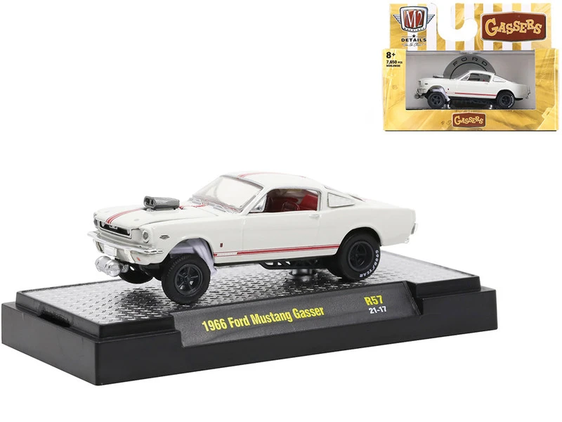 - 4) 1966 Ford Mustang Gasser Wimbledon White with Red Interior and Red Stripes.