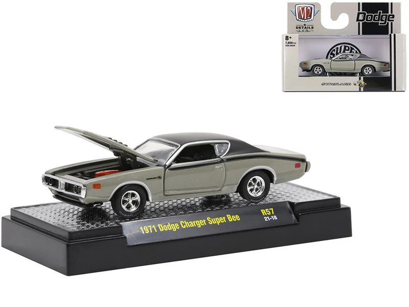 - 5) 1971 Dodge Charger Super Bee Silver Green Metallic with Black Vinyl Top and Black Stripes.