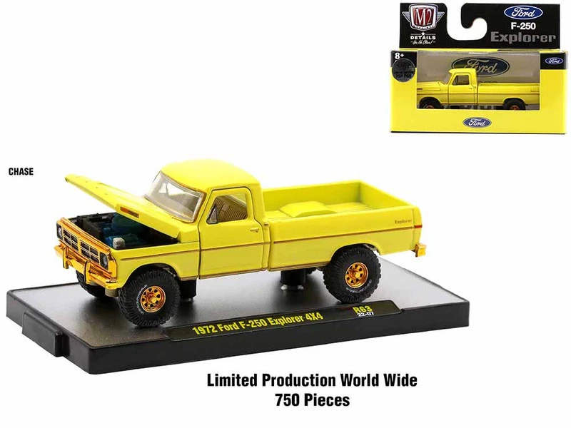 - CHASE TRUCK: 1972 Ford 250 Explorer 4×4 Pickup Truck. The Body is Yuma Yellow, the Interior is Gold, The Rims are Gold Chrome. Since this is a CHASE TRUCK: The Trim, Bumpers, Grill & Rims are now Gold Chrome, The Interior and Chassis is now Gold. Limited Edition to 750 pieces Worldwide.