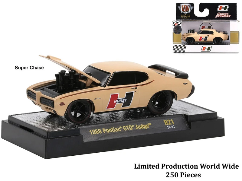 - SUPER CHASE CAR: 1969 Pontiac GTO Judge “Hurst”. The Body is Semi-Gloss PMS 726 C, The Judge Stripe bottom color is Bright Red, The Judge Stripe middle color is Gold, The Judge Stripe Top Color is Black, The Trim, Bumper and Rims are Black, The Engine is Black. Limited Edition to 250 pieces Worldwide.