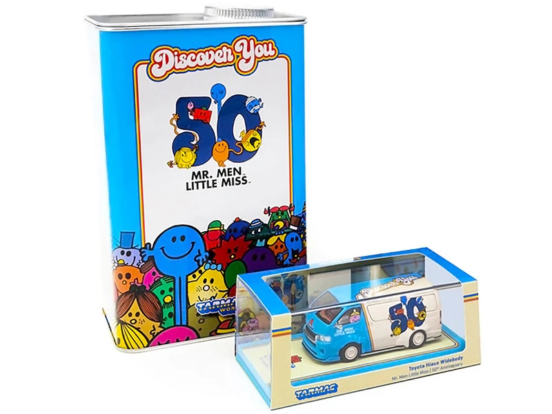 - Brand new 1/64 scale diecast car model of Toyota Hiace Widebody Van “Mr. Men Little Miss 50th Anniversary” (1971-2021) with METAL OIL CAN die cast model car by Tarmac Works.